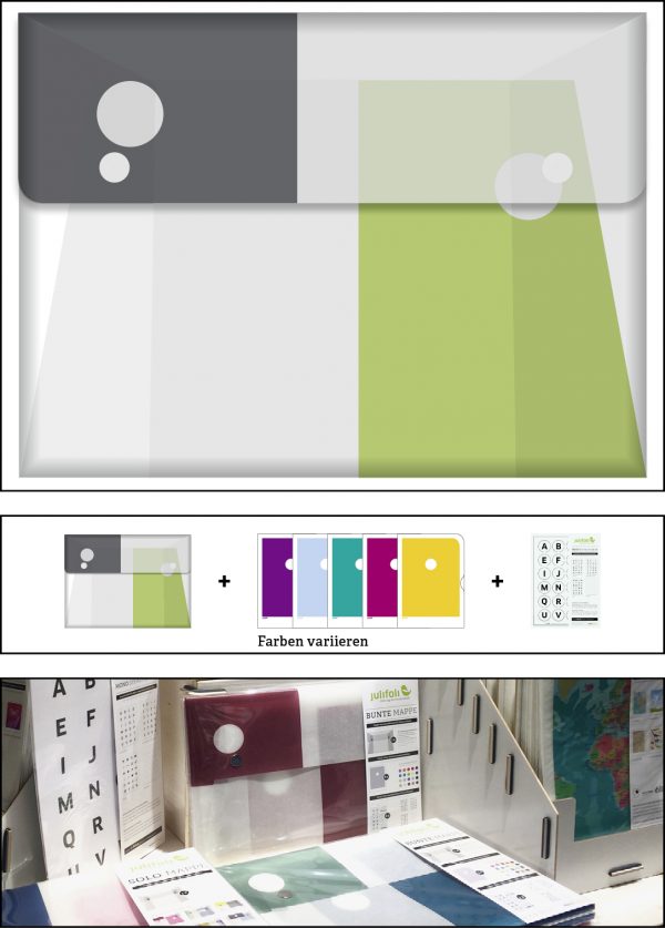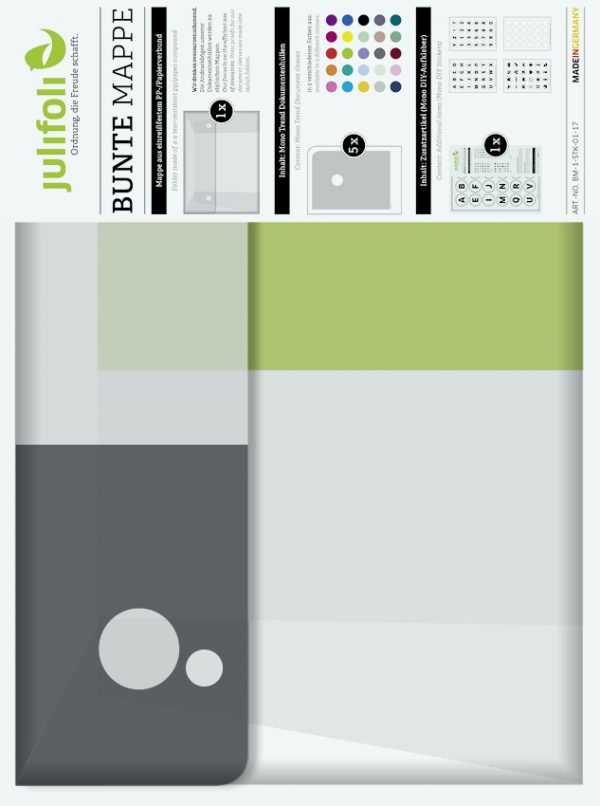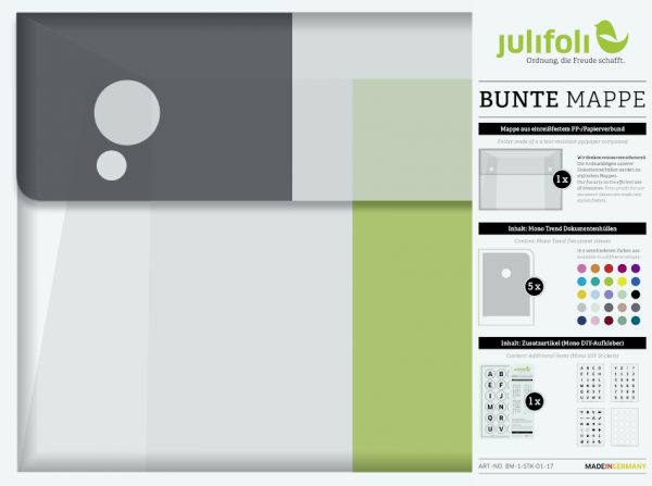 Wir denken ressourcenschonend: Die Andruckbögen unserer Dokumentenhüllen-Produktion werden zu dieser stylischen Sammelmappe. Anders als die SOLO MAPPE ist die BUNTE MAPPE gefüllt mit fünf verschiedenen Dokumentenhüllen aus der Serie MONO TREND (Inhalt: beliebige Farbauswahl) und einer Verpackungseinheit DIY-Aufklebern. Die BUNTE MAPPE ist komplett ohne Hilfsmittel von Hand gesteckt und wird nur mit zwei Magneten verschlossen. In ihr lassen sich die JuliFoli-Dokumentenhüllen perfekt sammeln. Super für unterwegs und als Geschenk für Ordnungsliebhaber und moderne Nomaden. Lieferung mit Inhalt.