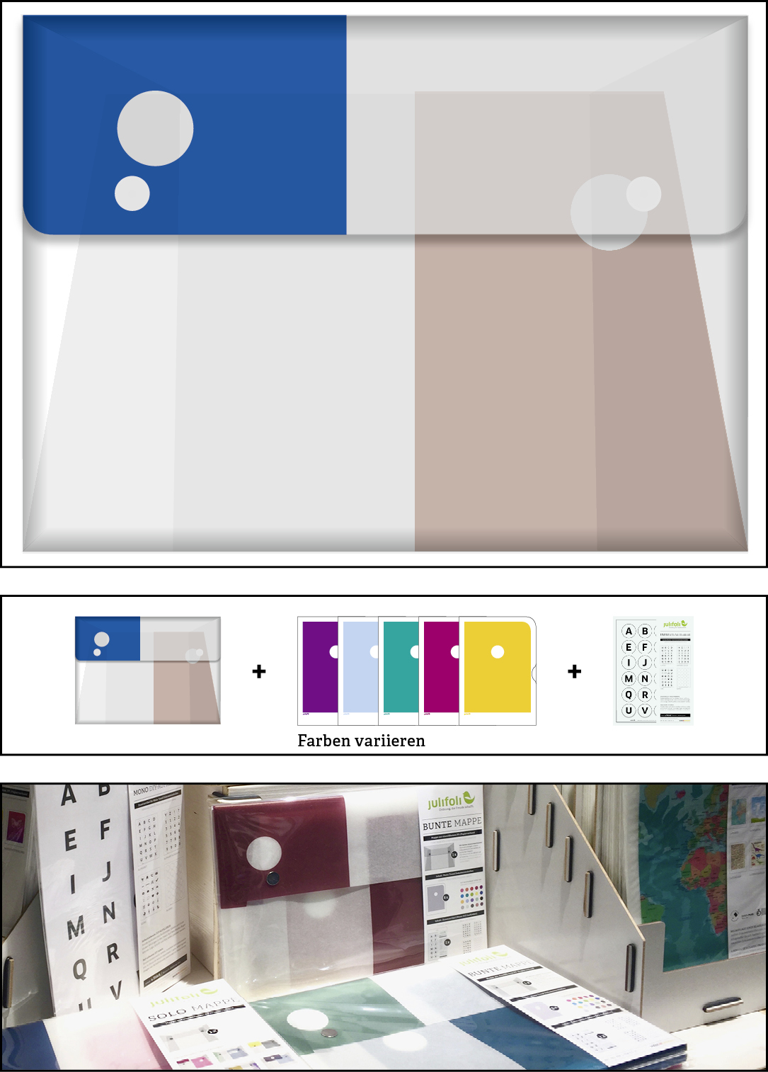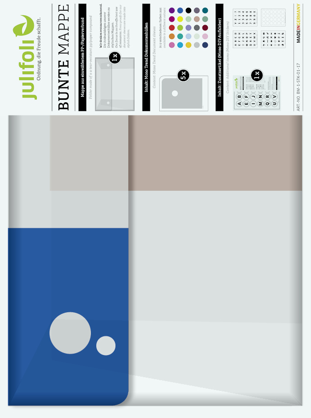 Wir denken ressourcenschonend: Die Andruckbögen unserer Dokumentenhüllen-Produktion werden zu dieser stylischen Sammelmappe. Anders als die SOLO MAPPE ist die BUNTE MAPPE gefüllt mit fünf verschiedenen Dokumentenhüllen aus der Serie MONO TREND (Inhalt: beliebige Farbauswahl) und einer Verpackungseinheit DIY-Aufklebern. Die BUNTE MAPPE ist komplett ohne Hilfsmittel von Hand gesteckt und wird nur mit zwei Magneten verschlossen. In ihr lassen sich die JuliFoli-Dokumentenhüllen perfekt sammeln. Super für unterwegs und als Geschenk für Ordnungsliebhaber und moderne Nomaden. Lieferung mit Inhalt.
