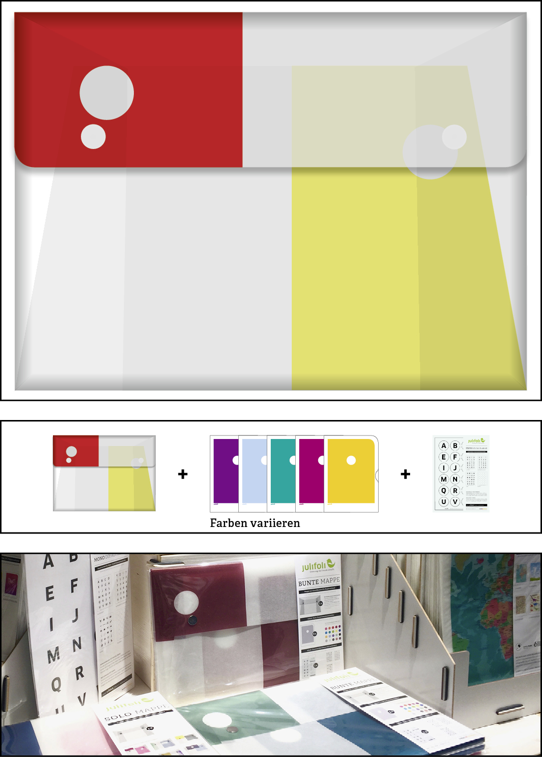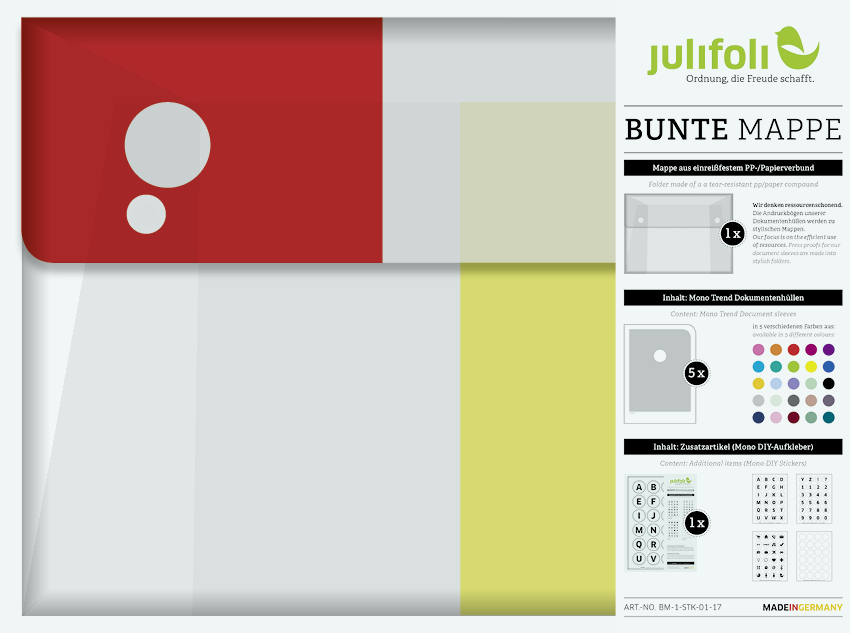 Wir denken ressourcenschonend: Die Andruckbögen unserer Dokumentenhüllen-Produktion werden zu dieser stylischen Sammelmappe. Anders als die SOLO MAPPE ist die BUNTE MAPPE gefüllt mit fünf verschiedenen Dokumentenhüllen aus der Serie MONO TREND (Inhalt: beliebige Farbauswahl) und einer Verpackungseinheit DIY-Aufklebern. Die BUNTE MAPPE ist komplett ohne Hilfsmittel von Hand gesteckt und wird nur mit zwei Magneten verschlossen. In ihr lassen sich die JuliFoli-Dokumentenhüllen perfekt sammeln. Super für unterwegs und als Geschenk für Ordnungsliebhaber und moderne Nomaden. Lieferung mit Inhalt.