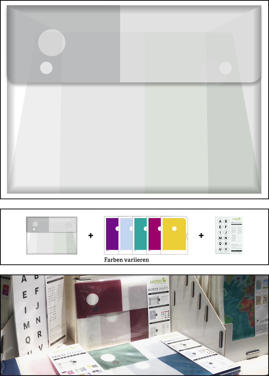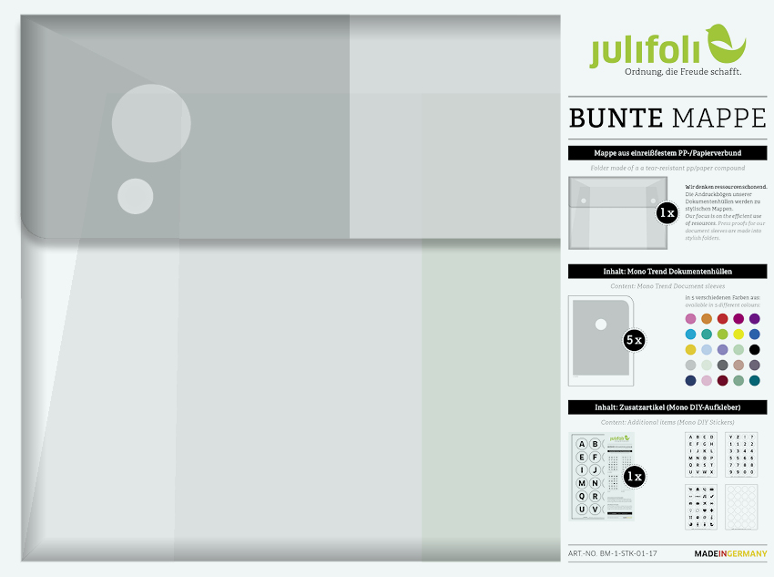Wir denken ressourcenschonend: Die Andruckbögen unserer Dokumentenhüllen-Produktion werden zu dieser stylischen Sammelmappe. Anders als die SOLO MAPPE ist die BUNTE MAPPE gefüllt mit fünf verschiedenen Dokumentenhüllen aus der Serie MONO TREND (Inhalt: beliebige Farbauswahl) und einer Verpackungseinheit DIY-Aufklebern. Die BUNTE MAPPE ist komplett ohne Hilfsmittel von Hand gesteckt und wird nur mit zwei Magneten verschlossen. In ihr lassen sich die JuliFoli-Dokumentenhüllen perfekt sammeln. Super für unterwegs und als Geschenk für Ordnungsliebhaber und moderne Nomaden. Lieferung mit Inhalt.