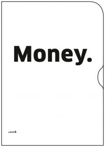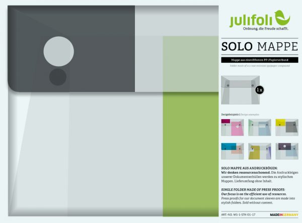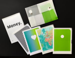 JuliFoli-Geschenk-Set mit einer Auswahl an 5 Designhüllen und passender Sammelmappe. 5 Hüllen: Money, Streifen Schwarz, Von Herzen, Kartenausschnitt, Mono Trend Grün.