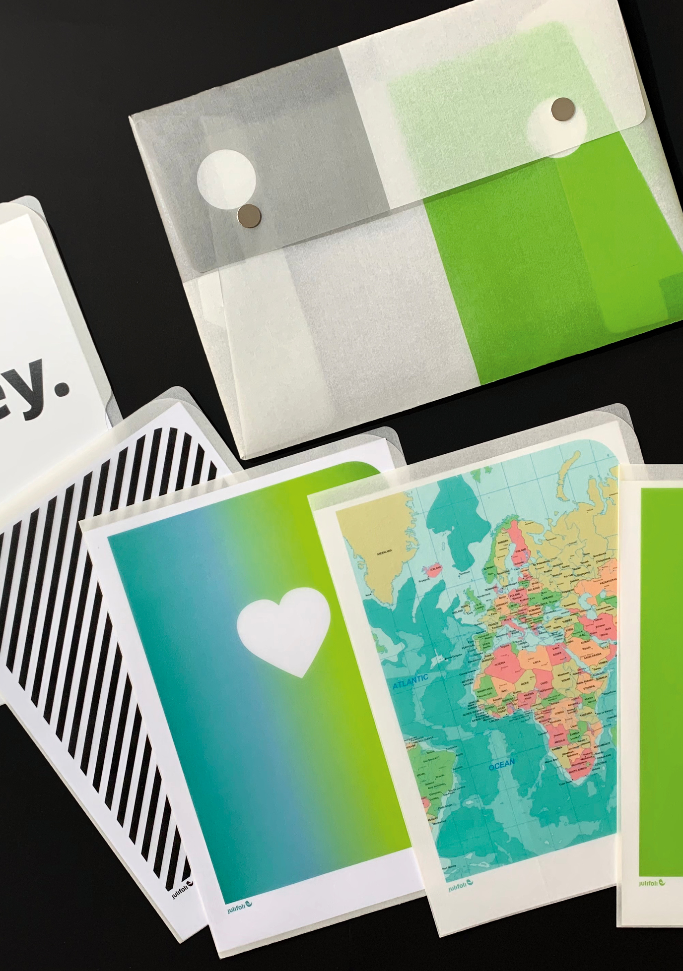 JuliFoli-Geschenk-Set mit einer Auswahl an 5 Designhüllen und passender Sammelmappe. 5 Hüllen: Money, Streifen Schwarz, Von Herzen, Kartenausschnitt, Mono Trend Grün.