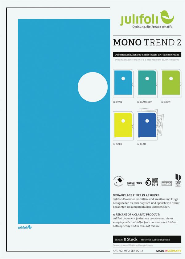 Die Serie MONO TREND 2 bietet die Möglichkeit seine individuelle Ordnung zu schaffen. Entweder allein durch die brillianten Farben Gelb, Grün, Blaugrün, Cyan und Blau oder durch die Individualisierung mit dem Verbrauchsartikel MONO DIY AUFKLEBER.