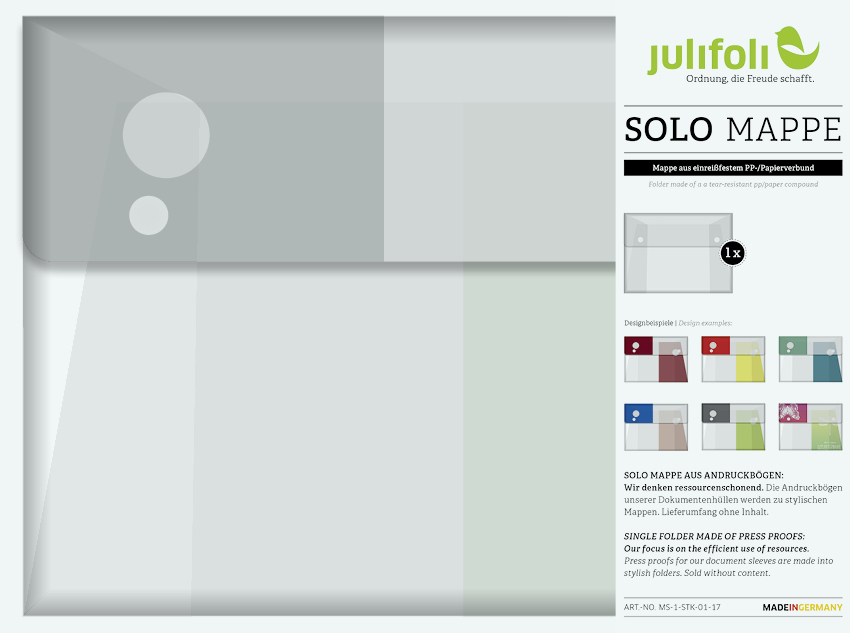Wir denken ressourcenschonend: Die Andruckbögen unserer Dokumentenhüllen-Produktion werden zu dieser stylischen Sammelmappe. In der SOLO MAPPE lassen sich die JuliFoli-Dokumentenhüllen perfekt sammeln. Super für unterwegs und als Geschenk für Ordnungsliebhaber und moderne Nomaden! Die SOLO MAPPE ist komplett ohne Hilfsmittel von Hand gesteckt und wird nur mit zwei Magneten verschlossen. Lieferung ohne Inhalt.