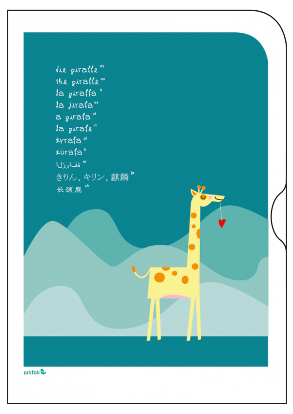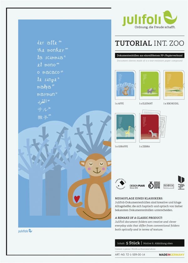 Die TUTORIAL Serien liegen uns besonders am Herzen: Die Serie TUTORIAL Internationaler Zoo garantiert den „Genies von Morgen“ einen spielerischen Einstieg in die Vielfalt der Sprache. Die farbenfrohen Illustrationen sollen den interkulturellen Austausch von Kindern in Hort, Schule & Co. unterstützen. Derzeit gibt es die ersten fünf Zootiere im internationalen Zoo von JuliFoli: Elefant, Krokodil, Giraffe, Affe, Zebra.