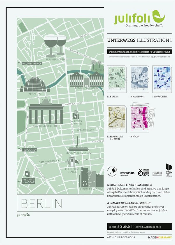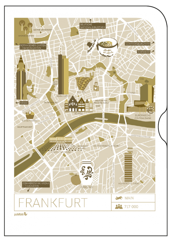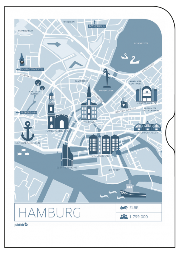 Wegweisend sind die neuen Dokumentenhüllen mit stylischen Stadtplan-Illustrationen. Die Serie UNTERWEGS Illustration 1 ist, mit einer Auswahl unserer deutschen (Lieblings-)Städte, perfekt für den Kurztripp oder als Geschenk für echte „Großstadtpflanzen“. Die Serie beinhaltet die Städte Hamburg, Frankfurt, Köln, Berlin, München.