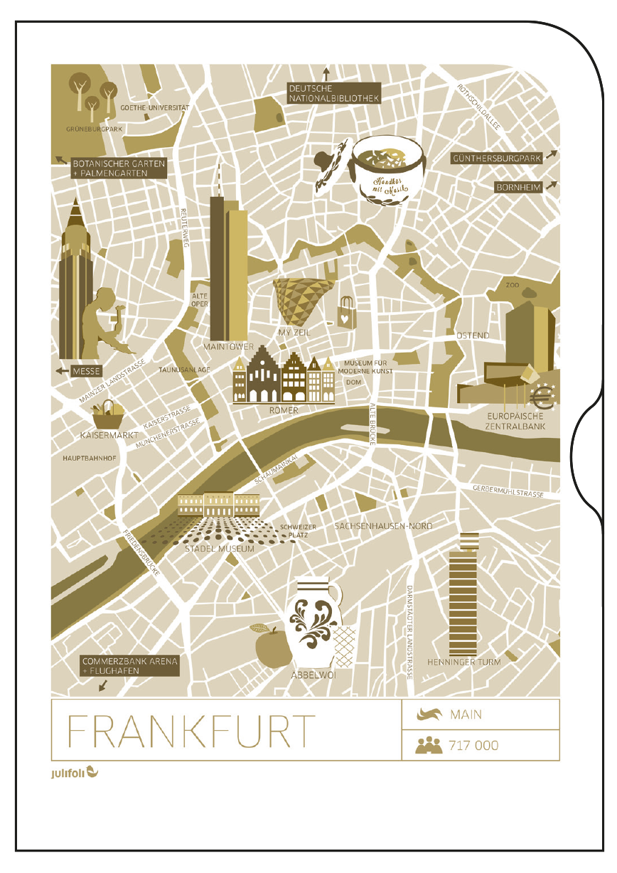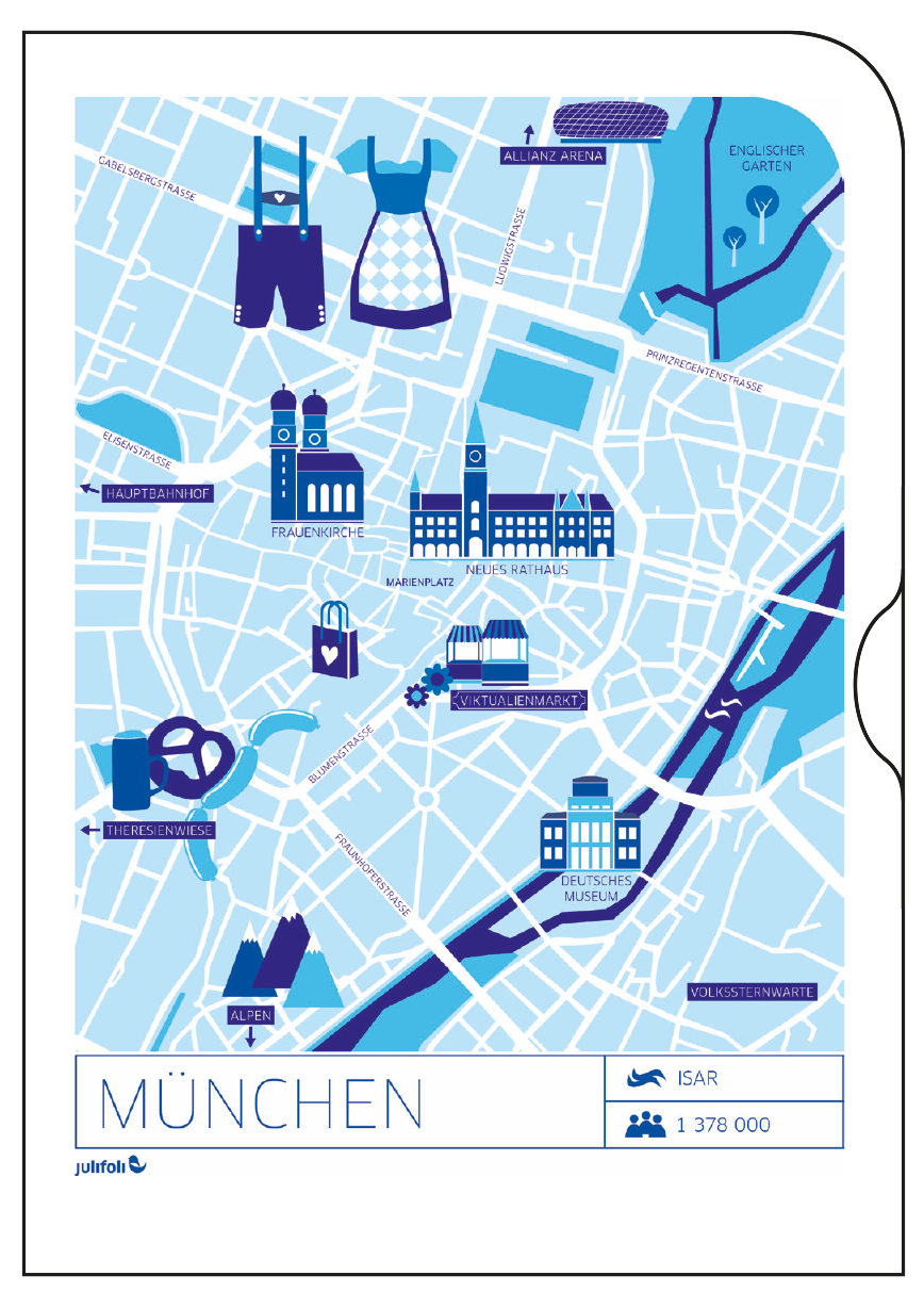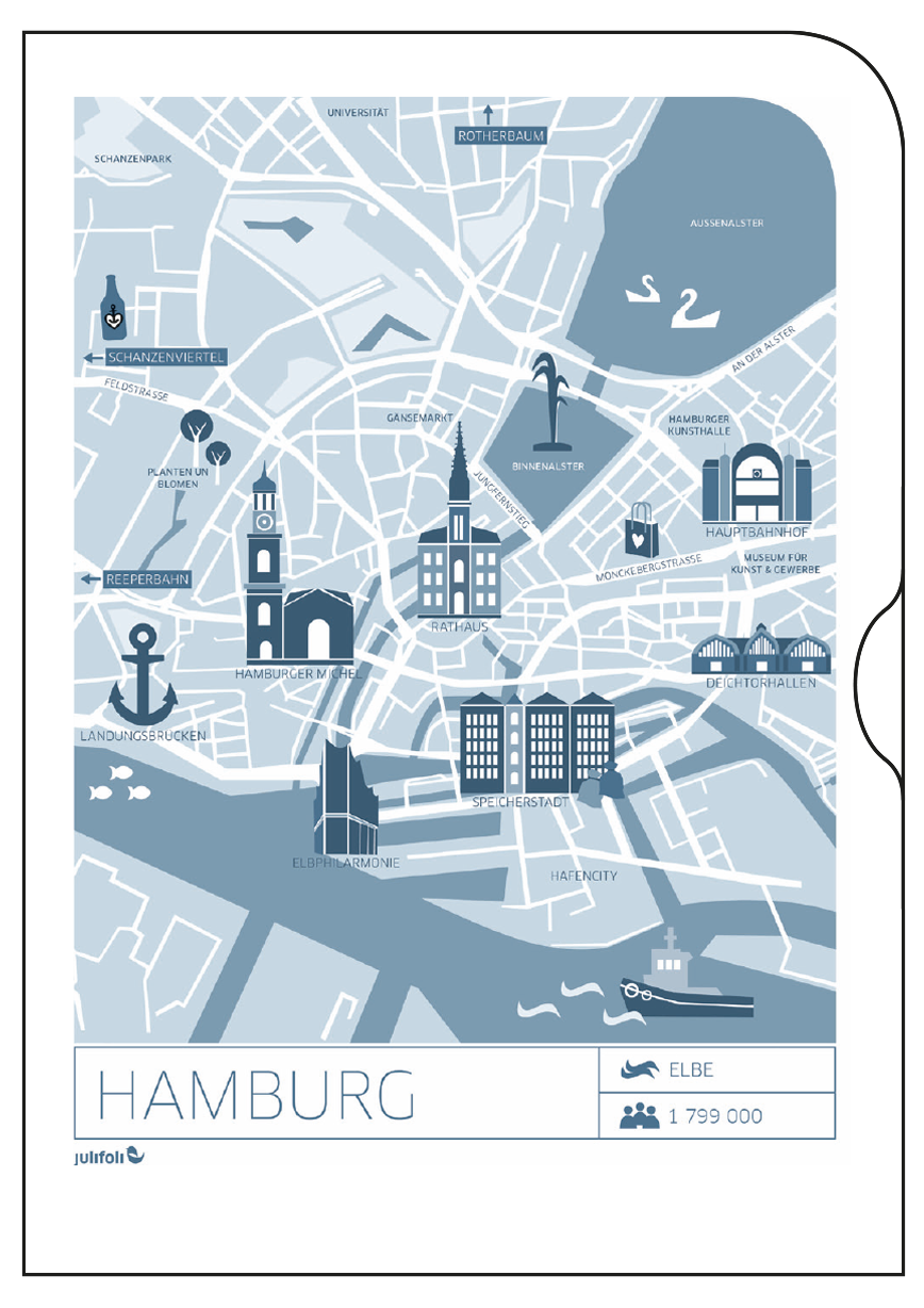 Wegweisend sind die neuen Dokumentenhüllen mit stylischen Stadtplan-Illustrationen. Die Serie UNTERWEGS Illustration 1 ist, mit einer Auswahl unserer deutschen (Lieblings-)Städte, perfekt für den Kurztripp oder als Geschenk für echte „Großstadtpflanzen“. Die Serie beinhaltet die Städte Hamburg, Frankfurt, Köln, Berlin, München.
